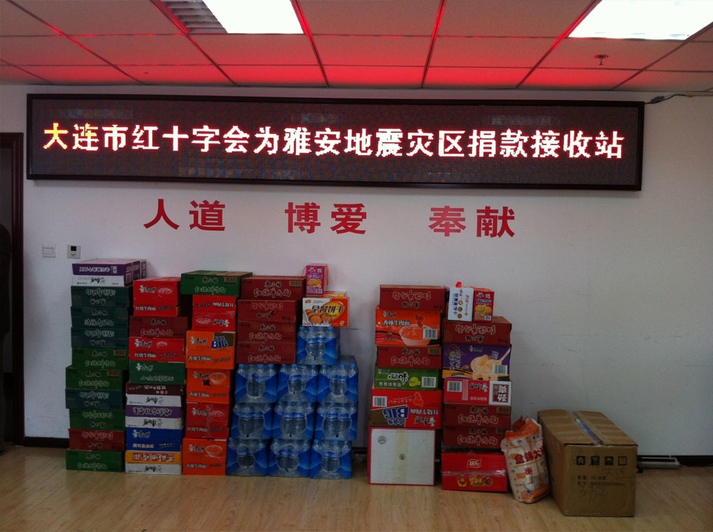 “4•20”四川雅安发生地震后。我公司领导高度关切并紧急发起倡议为四川雅安灾区捐物、献爱心。4月28公司领导及员工代表以发扬中华民族“一方有难、八方支援”的优良传统;将食品、捐款、应急用品等物资一同送往大连市红十字会。市红十字会对中心爱心捐助表示感谢,并表示将于5月初把爱心物资送往灾区。